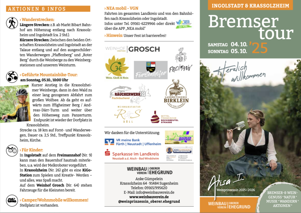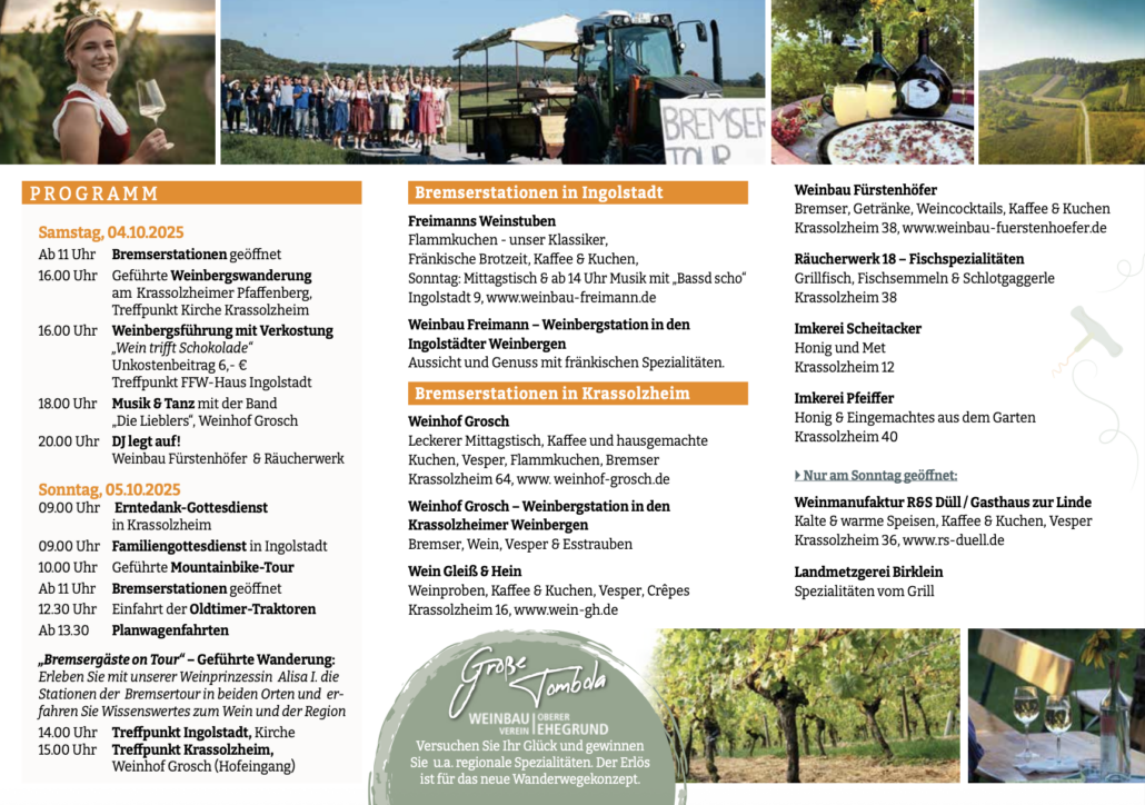 Ganz Krassolzheim verwandelt sich dann in eine große Fußgängerzone. Viele Winzer und Höfe bieten fränkische Spezialitäten an. Natürlich gibt es außer dem Bremser (= Traubensaft in der Vergärung) noch mehr fränkische Köstlichkeiten.